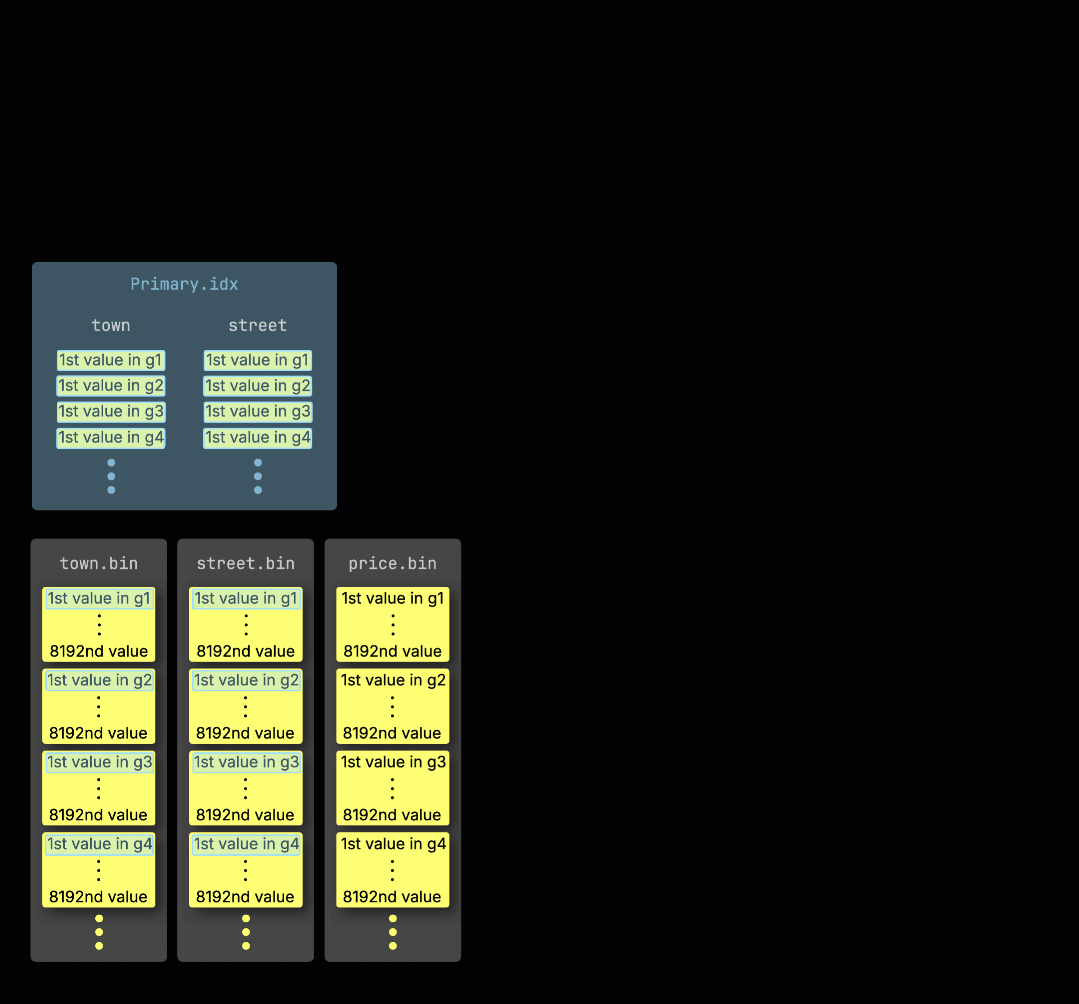 When ClickHouse ① runs an aggregation query with a filter on the table’s primary key, it ② loads the primary index into memory to ③ identify which granules need to be processed, and which can be safely skipped: